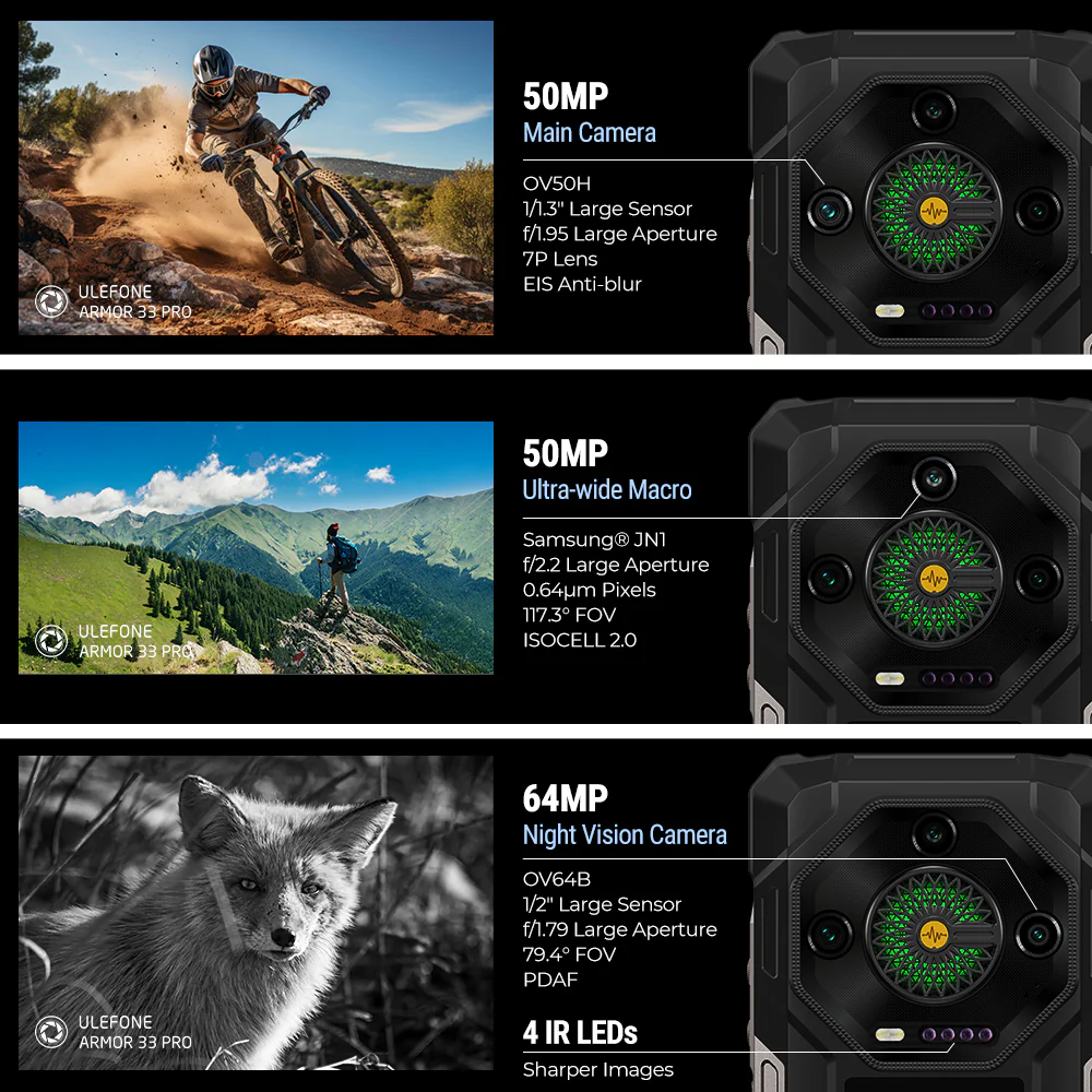 Il telefono rugged Ulefone Armor 33 Pro 5G è dotato di una fotocamera principale da 50 MP, una fotocamera ultra-grandangolare da 50 MP e una fotocamera a infrarossi per la visione notturna da 64 MP, che ti permettono di immortalare tutte le tue avventure. La fotocamera selfie da 32 MP garantisce videochiamate e vlog impeccabili. Un pulsante fisico dedicato alla fotocamera elimina la necessità di sbloccare lo schermo. Una pressione prolungata avvia istantaneamente l'app della fotocamera e un tocco delicato ti consente di catturare il momento perfetto.